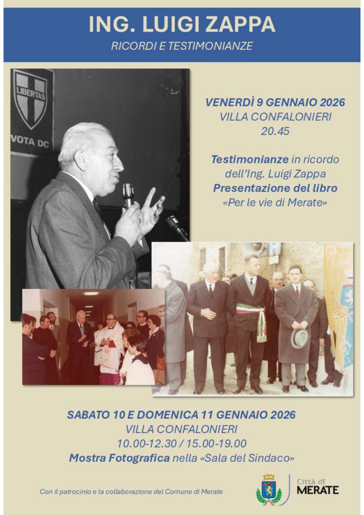 In occasione del ventennale della scomparsa dell’Ing. Luigi Zappa, sindaco di Merate dal 1964 al 1975, le figlie invitano a partecipare ad un momento commemorativo previsto il giorno 9 gennaio 2026 alle ore 20.45 presso Villa Confalonieri. Per l’occasione sarà presentato il libro “Per le vie di Merate”. Si terrà presso Villa Confalonieri, nella Sala del Sindaco, la Mostra Fotografica nei giorni di sabato 10 e domenica E 11 gennaio 2026 (Orari di apertura: 10.00-12.30 / 15.00-19.00).