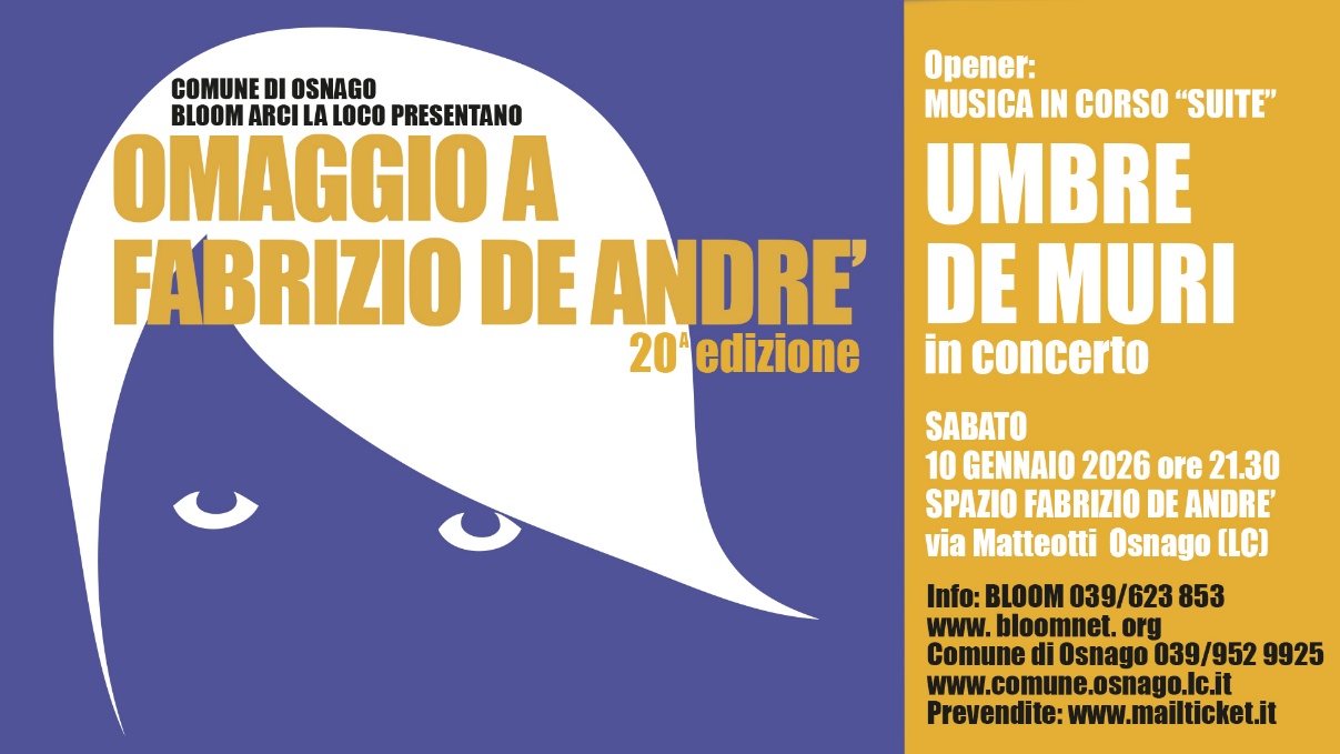 Sabato 10 gennaio lo Spazio Fabrizio De André di Osnago ospiterà la 20ª edizione dell’“Omaggio a Fabrizio De André”, appuntamento ormai immancabile nel panorama culturale del territorio. A 27 anni esatti dalla scomparsa del grande poeta cantautore, il Comune di Osnago, con la direzione artistica del Bloom e la collaborazione di Arci La Lo.Co, propone un concerto speciale affidato al progetto “Umbre de Muri”. In apertura, i giovani musicisti della scuola “Musica in Corso” di Cernusco Lombardone presenteranno una suggestiva “Suite” dedicata a De André. Inizio spettacoli alle 21.30. Prevendite su Mailticket, biglietti disponibili anche in cassa serale.