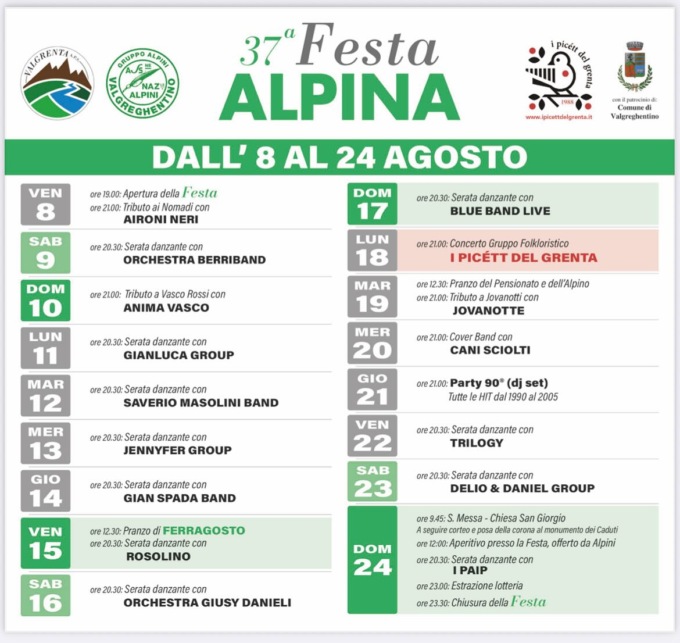 Torna uno degli appuntamenti più attesi dell’estate lecchese: la Festa Alpina di Valgreghentino, giunta quest’anno alla sua 37ª edizione, animerà il paese dall’8 al 24 agosto 2025 con un ricco calendario di eventi all’insegna della musica dal vivo, della tradizione alpina, della convivialità e della solidarietà.
