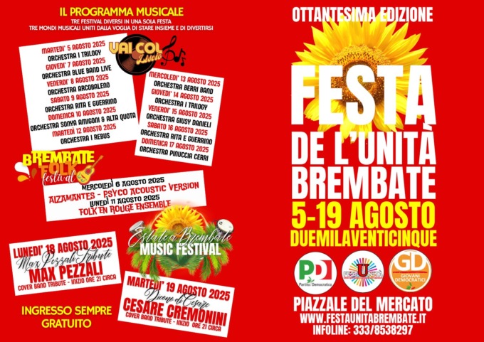 Un traguardo storico per il Partito Democratico bergamasco: la Festa de L’Unità di Brembate celebra quest’anno il suo 80° anniversario. Dal 5 al 19 agosto, l’Area Feste di Via Tiziano Vecellio si trasformerà in un grande spazio di confronto, cultura e festa, con grandi ospiti come Emilio Del Bono, Silvia Roggiani, Stefano Bonaccini, Ouidad Bakkali e Giorgio Gori. In programma 15 giorni di appuntamenti, dibattiti sui temi più attuali della politica locale e nazionale, ma anche tanta musica, buon cibo e intrattenimento per tutte le età.