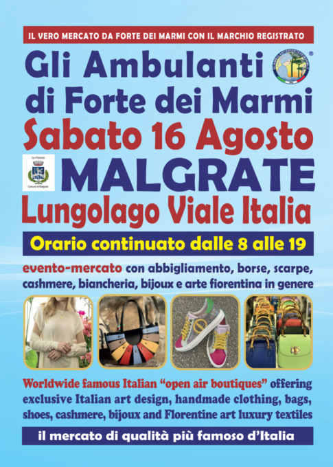 Gli Ambulanti di Forte dei Marmi®, le bancarelle del mercato di qualità più famoso d’Italia, tornano finalmente per l’estate a grandissima richiesta sul ramo lecchese del Lago di Como con il loro show itinerante all’insegna del meglio del Made in Italy artigianale e delle ultime tendenze della moda. Si potranno infatti ammirare le ormai mitiche boutique a cielo aperto® dell’originale Consorzio sabato 16 agosto a MALGRATE, alle porte di Lecco, nella incantevole cornice del Lungolago di Viale Italia, con il patrocinio dell’amministrazione comunale. Dunque, un’occasione da non perdere assolutamente per i tanti appassionati del genere, che l’hanno a lungo reclamata: una rassegna dello shopping più glamour e conveniente, con orario continuato, anche in caso di maltempo, dalle 8 alle 19.
