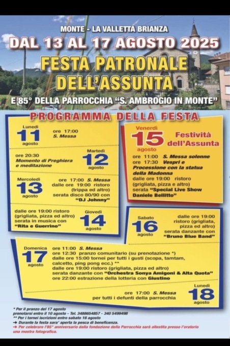 Dal 13 al 17 agosto torna la Festa patronale d e l l’Assunta e quest’anno ricorre anche l’85° di fondazione della Parrocchia Sant’Ambrogio di Monte. Il clou della manifestazione ovviamente venerdì 15 agosto, con la Messa solenne delle 11, mentre alle 17.30 sono in programma i Vespri, ai quali seguirà la processione con la statua della Madonna. Tutte le sere musica e buona cucina, con grigliata, pizza e altre specialità. Mercoledì 13 sarà possibile degustare anche la trippa. Il 17 agosto pranzo comunitario su prenotazione (tel. 3488654857) e tornei per tutti i gusti.