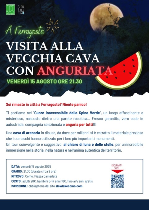 Venerdì 15 agosto ore 21.30 “Ferragosto in Cava”… un fresco fuori programma per chi è in città. Visita guidata serale nel “Cuore inaccessibile della Spina Verde”, un luogo affascinante e misterioso, nascosto dietro una parete rocciosa e normalmente chiuso al pubblico, con anguriata finale per tutti. Una cava di arenaria in disuso, da dove per millenni si è estratto il materiale prezioso che i comaschi hanno utilizzato per i loro più importanti monumenti. Un tour coinvolgente e suggestivo, al chiaro di luna e delle stelle, per un’incredibile immersione nella storia, nella natura e nell’anima autentica del territorio. Con una bella fetta di anguria da gustare in compagnia per augurarsi Buon Ferragosto. Ritrovo a Como, in piazza Camerlata. Costo escursione di adulti 20€, bambini 6-14 anni 10€, fino ai 5 anni gratis.