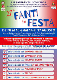 Nei due fine settimana dall’8 al 10 agosto e dal 14 al 17 agosto, nel piazzale del centro parrocchiale Don Battista Paltenghi, andrà in scena la 27esima edizione della Festa dei Fanti, promossa dall’Associazione Fanti Calusco, col patrocinio del Comune e in collaborazione con l’oratorio. In queste sette serate, sarà attivo il servizio cucina e pizzeria, bar musica dal vivo e intrattenimento per i più piccoli.