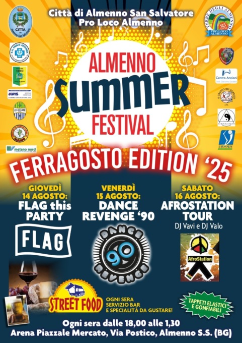 Almenno Summer Music Festival ritorna in edizione speciale a Ferragosto ad Almenno San Salvatore, tre serate una più interessante dell’altra, per tutti i gusti e palati, un evento pensato per divertirsi ma anche per unire. Il Comune di Almenno S.S. e Pro Loco Almenno vi aspettano Giovedì 14, Venerdì 15, Sabato 16 Agosto ogni sera dalle 18 fino alle ore 1.30 all’Arena Piazzale Mercato.