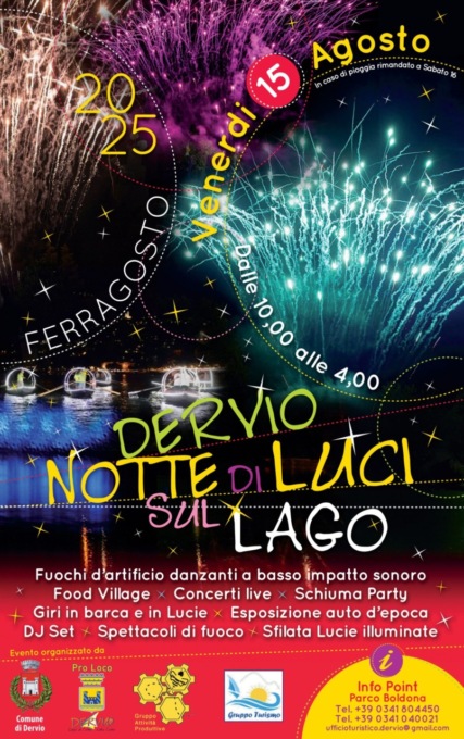 Un Ferragosto diverso, che negli ultimi anni è diventato punto di riferimento per migliaia di persone, si snoda sui chilometri di lungolago di Dervio. Una festa per tutta la giornata, dalle 10 del mattino fino alla notte, con una varietà di spettacoli e attrazioni, dalla baby dance allo schiuma party passando all’esposizione delle auto d’epoca fino ai giri in barca a vela, canoa surf. Poi lo spettacolo dei mangiafuoco e delle ballerine del fuoco, le bancarelle della fiera. Al culmine della serata uno spettacolo pirotecnico di fuochi d’artificio danzanti con coreografie musicali illuminerà la baia del porto vecchio.