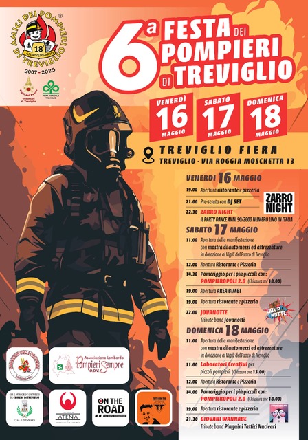 L’associazione “Amici dei Pompieri di Treviglio”, in collaborazione con i “Vigili del Fuoco Volontari di Treviglio” organizza la Festa dei Pompieri dal 16 al 18 maggio. Il ricavato dell’intera manifestazione sarà devoluto al distaccamento dei Vigili del Fuoco Volontari di Treviglio per l’acquisto di attrezzature di intervento e soccorso.