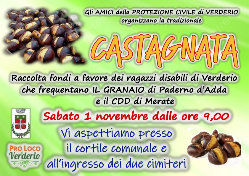 Tempo di caldarroste e solidarietà nel Lecchese. Sabato 1° novembre, gli Amici della Protezione Civile di Verderio organizzano la tradizionale Castagnata con raccolta fondi a favore dei ragazzi disabili che frequentano Il Granaio di Paderno d’Adda e il CDD di Merate. L’appuntamento è dalle 9 del mattino nel cortile comunale e all’ingresso dei cimiteri.