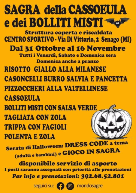 Un evento atteso dai buongustai. Con un ricco menù dove assaggiare bolliti misti, ossobuco e tante altre specialità. L’appuntamento è con la sagra della cassoeula, bolliti misti e ossobuco al centro sportivo di Senago, dal 31 ottobre al 16 novembre, tutti i venerdì, sabato e domenica sera e con apertura anche a pranzo la domenica. L’evento si svolge in struttura coperta e riscaldata e offrirà un menù ricco di piatti tradizionali lombardi: tra questi cassoeula, bolliti misti con salsa verde, risotto giallo alla milanese, casoncelli burro, salvia e pancetta, pizzoccheri alla valtellinese, trippa con fagioli, polenta e zola e molto altro.