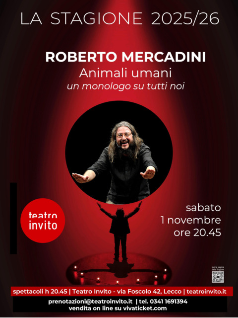 Vi ricordiamo il primo appuntamento della Stagione serale di Teatro Invito, sabato 1 novembre, alle 20.45, Roberto Mercadini presenta il nuovo spettacolo Animali Umani.  Un viaggio ironico nell’epopea della nostra specie: dall’animale politico di Aristotele alla scimmia nuda di Desmond Morris, passando per guerre, culti, fuoco e cibo. Una panoramica a tratti comica, a tratti vertiginosa, per capire cosa siamo. Cosa ci distingue e cosa ci accomuna agli scimpanzé, alle formiche, ai virus, a ogni altra parte della Natura.
