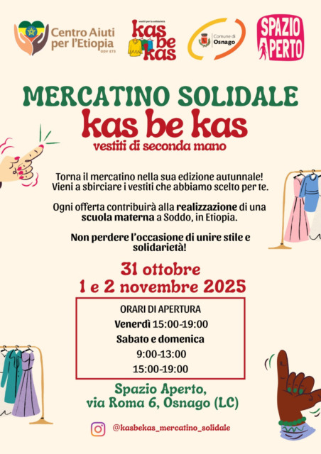 Venerdì 31 ottobre, Sabato 1 e Domenica 2 novembre arriva a Spazio Aperto (Via Roma 6 a Osnago) KAS BE KAS, il mercatino solidale che permetterà di acquistare abbigliamento second hand di qualità, con lo scopo di raccogliere fondi per aiutare il Centro Aiuti per l’Etiopia nella realizzazione di una scuola materna a Soddo, in Etiopia.  Orari di apertura: – venerdì 15:00-19; – sabato e domenica 9-13 , 15-19.