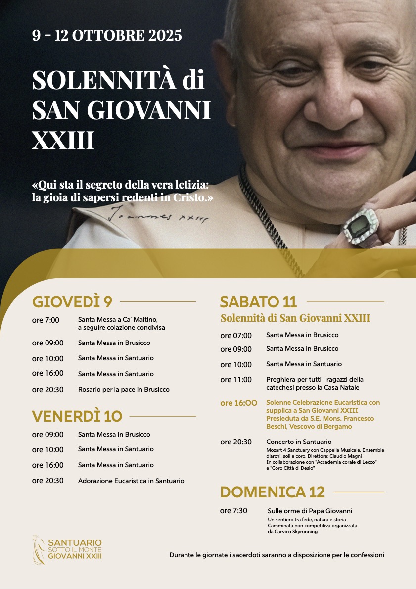 La Settimana Giovannea prenderà avvio giovedì 9 ottobre con la tradizionale Giornata del Papa, che ripercorre lo stile semplice e quotidiano di Angelo Giuseppe Roncalli durante le vacanze a Sotto il Monte. La giornata inizierà alle 7.00 con la Messa a Ca’ Maitino seguita dalla colazione condivisa, proseguirà con le Messe a Brusicco (ore 9.00) e in Santuario (ore 10.00 e 16.00), per concludersi in serata con il Rosario per la pace nella chiesa di Santa Maria in Brusicco, luogo che custodisce le radici battesimali e sacerdotali del futuro Pontefice.