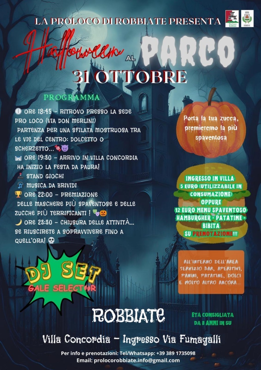 Alle 19.30 arrivo in Villa Concordia con inizio della festa tra stand, giochi, musica da brividi e cena su prenotazione. Alle 22 i volontari della Pro Loco premieranno le maschere più spaventose e le zucche più terrificanti. Per informazioni 389.1735098 oppure prolocorobbiate.info@gmail.com.