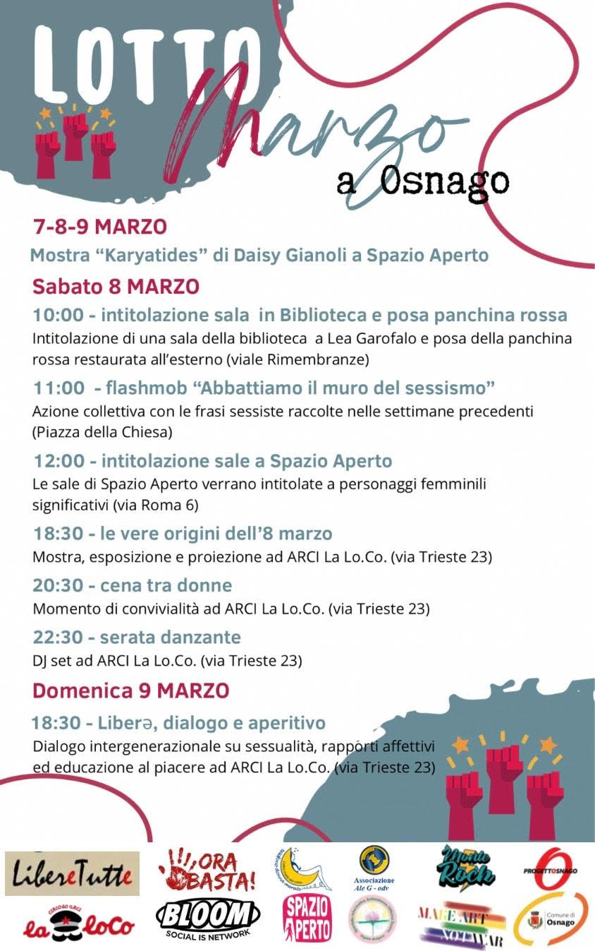 Festa della donna: spazi pubblici intitolati a figure femminili. In occasione della Giornata Internazionale della Donna, il Comune di Osnago, in collaborazione con gruppi e associazioni di donne e non solo, del territorio, organizzano una varietà di eventi volti a sensibilizzare la cittadinanza sull’eguaglianza di genere. Flash mob, performance, mostre, incontri, musica, intitolazioni sale, posa panchina e momenti conviviali.