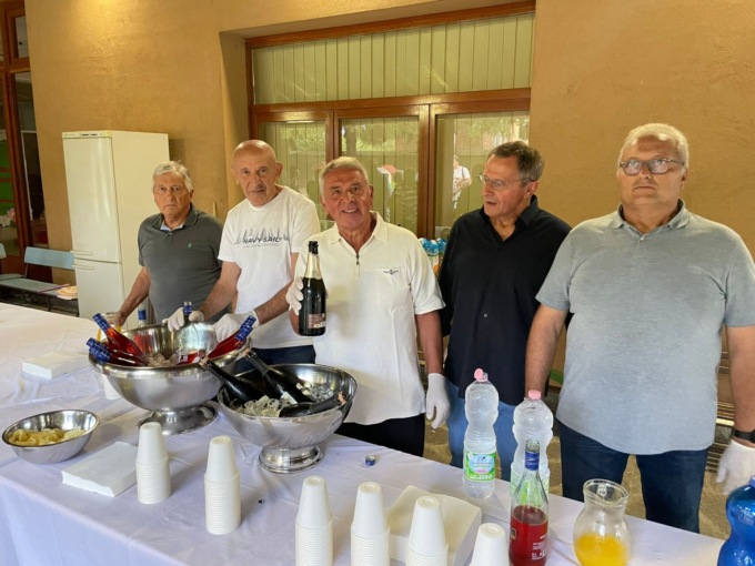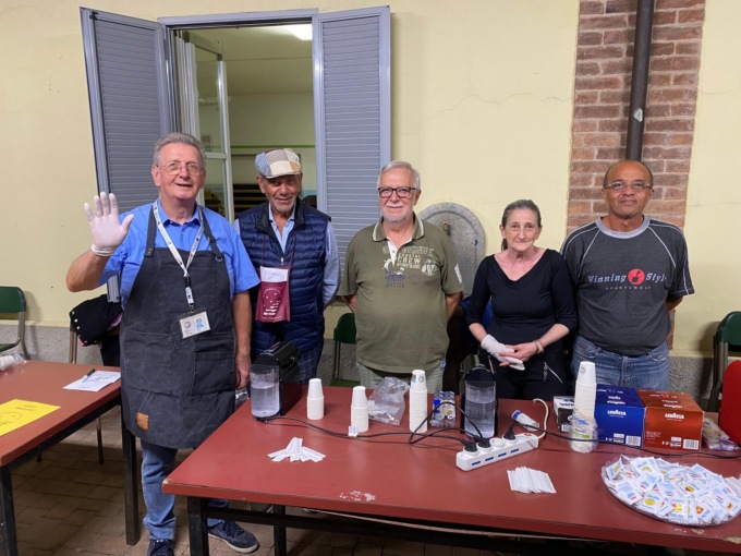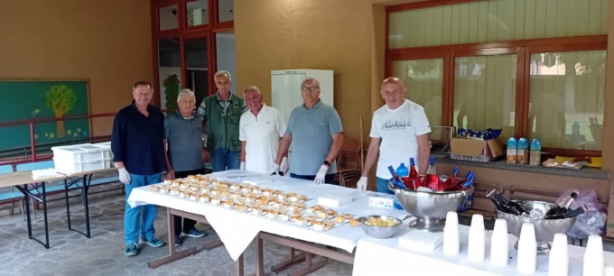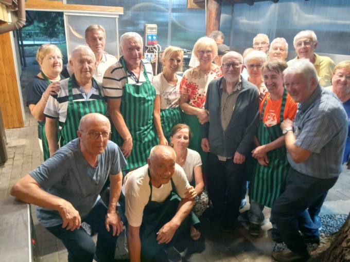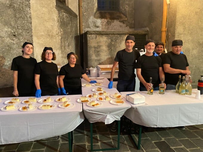Il gruppo dell’associazione Amici del teatro dietro la chiesa a servire il dolce