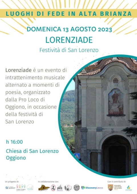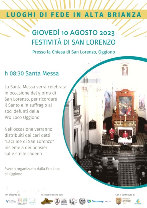 Inoltre, in occasione della festività di San Lorenzo, la Pro Loco di Oggiono organizzerà due eventi: il 10 agosto la messa alle 8.30 per ricordare il Santo e in suffragio ai soci defunti della Pro Loco Oggiono; nell’occasione verranno distribuiti dei ceri detti “Lacrime di San Lorenzo” insieme a dei pensieri sulle stelle cadenti; il 13 agosto alle 16 si terrà invece “Lorenziade”, un evento di intrattenimento musicale alternato a momenti di poesia, organizzato in collaborazione con l’associazione Clerici Vagantes, capofila della rete di progetto, finanziato da Lario Reto Holding e Fondazione Comunitaria del Lecchese.