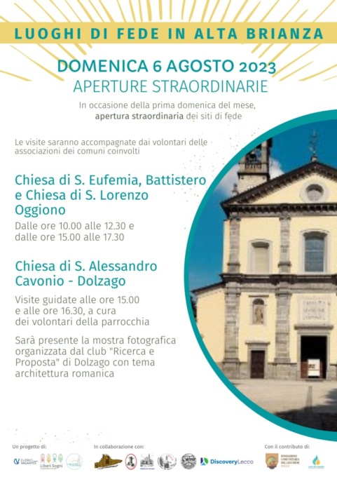 Domenica 6 agosto 2023 si terrà l’apertura straordinaria di alcuni importanti siti religiosi di Oggiono all’interno del progetto “I luoghi di fede in Alta Brianza”, cofinanziato dalla Fondazione Comunitaria del Lecchese Onlus e da Lario Reti Holding, che promuove la