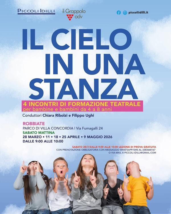 Un percorso per avvicinare bambine e bambini al teatro come spazio di espressione, scoperta e crescita personale. È questo l’obiettivo di “Il cielo in una stanza”, il ciclo di incontri di formazione teatrale dedicato ai bambini dai 4 agli 8 anni e organizzato dalla compagnia Piccoli Idilli.