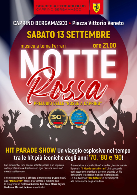Per la prima volta nella storia del Ferrari club, la manifestazione sarà improntata su due giorni. Sabato 13 Settembre si svolgerà la “Notte Rossa” all’insegna della musica anni ’70, ’80 e ’90 con il gruppo musicale Mamalover con musica dei Bee Gees, Gloria Gaynor Madonna, Michael Jackson. Vi saranno fumi scenici, effetti speciali e impianto professionale. Presentatore e vocalist Gianfranco Gori con le ballerine Red Sister. Ideatrice, ispiratrice, e anima della Serata la vicesindaca Daniela Martinelli.