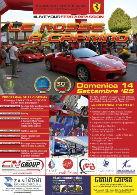Le Rosse a Caprino: tutto pronto per il 30° anniversario del Ferrari Club. Il Ferrari club Caprino Bergamasco, si appresta a celebrare il conferimento assegnatogli ufficialmente dalla Ferrari come “Top Club in the world”, un obiettivo che ormai viene raggiunto da molti anni o che comunque vede il sodalizio sul podio.