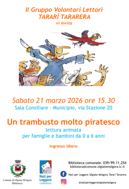L’appuntamento, dal titolo «Un trambusto molto piratesco», è pensato per una fascia d’età che va da 0 ai 6 anni e si svolgerà sabato 21 marzo alle 15.30 nella sala consiliare del Municipio (via Alla stazione 20). L’ingresso è libero e i bambini dovranno essere accompagnati da un genitore o da un familiare.