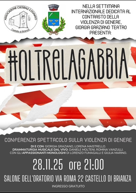 No alla violenza di genere con lo spettacolo “#Oltrelagabbia”. In occasione della Settimana Internazionale dedicata al contrasto della violenza di genere, il Comune di Castello di Brianza invita la cittadinanza a un evento che unisce arte, emozione e riflessione sociale: