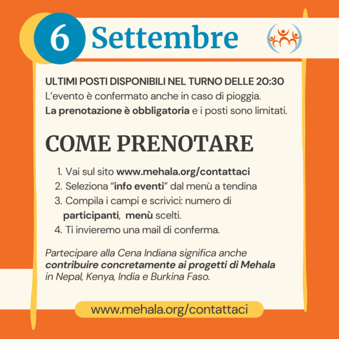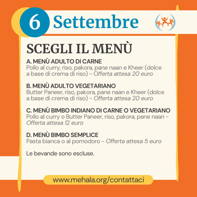 L’evento si terrà anche in caso di maltempo. Partecipare alla Cena Indiana significa condividere sapori e amicizia, ma anche contribuire concretamente ai progetti di Mehala per l’infanzia più fragile. Un piccolo gesto che fa una grande differenza nei Paesi dove l’associazione opera: