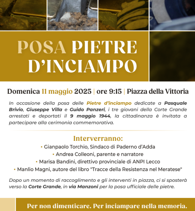 «Dopo un momento di raccoglimento in piazza, con gli interventi del sindaco Gianpaolo Torchio, del narratore e parente Andrea Colleoni, di Marisa Bandini del direttivo provinciale di Anpi Lecco e dello scrittore Manlio Magni, autore del libro “Tracce della Resistenza nel Meratese”, la cerimonia proseguirà alla Corte Grande, in via Manzoni, con la posa ufficiale delle pietre. Tutta la cittadinanza è invitata a partecipare per condividere questo momento di memoria e riflessione collettiva» fa sapere il Comune.