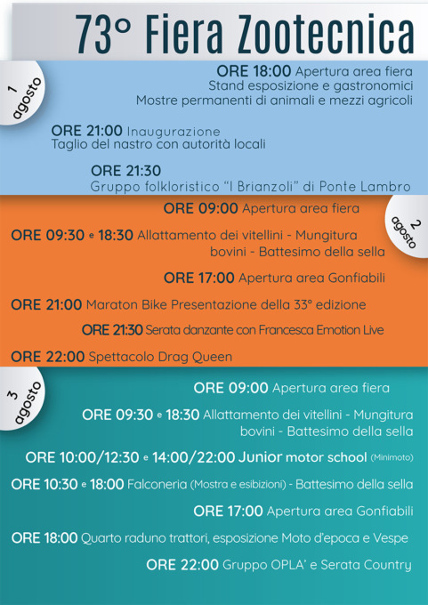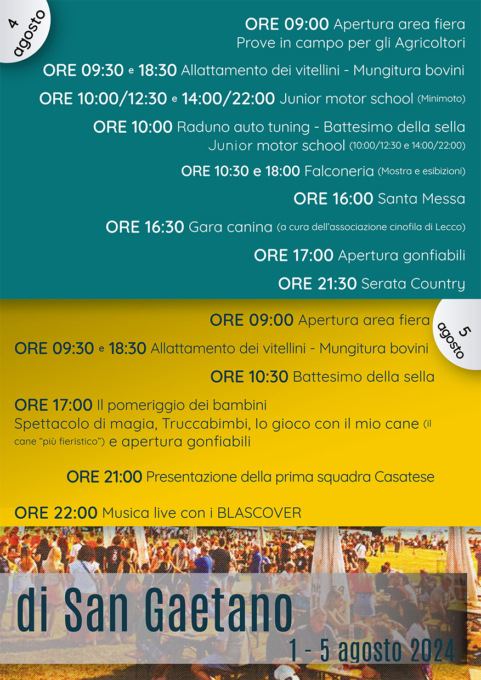 Ricco il programma (la versione integrale è disponibile qui): venerdì 2 agosto gonfiabili, allattamento dei vitellini e mungitura dei bovini, presentazione della Marathon Bike, serata danzante con Francesca Emotion Live e alle 22 spettacolo delle drag queen. Sabato 3 agosto Junior Motor School, falconeria, battesimo della sella, raduno dei trattori, delle moto d’epoca e delle vespe e in serata esibizione del gruppo Oplà e musica country. Domenica 4 agosto raduno di auto tuning, Messa, gara canina, prove degli agricoltori in campo aperto e di nuovo allattamento, falconeria e scuola di moto. Lunedì 5 agosto ultimo giorno con le solite attività ricorrenti e dalle 17 eventi dedicati ai bambini con magia, truccabimbi, gonfiabili e giochi con i cani. Alle 21 verrà presentata la prima squadra della Casatese, alle 22 concerto dei Blascover.