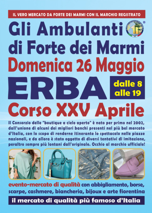 Gli Ambulanti di Forte dei Marmi: le bancarelle del mercato di qualità più famoso d’Italia tornano nel Comasco, a grandissima richiesta, con tutto il meglio del Made in Italy artigianale e le ultime tendenze della moda. Si potranno ammirare le ormai mitiche “boutique a cielo aperto” dell’originale Consorzio domenica 26 maggio a ERBA, nella consueta centrale location di Corso XXV Aprile. Dunque, un appuntamento da non perdere assolutamente per i tanti appassionati del genere, come sempre all’insegna dello shopping più glamour e conveniente, con orario continuato, anche in caso di maltempo, dalle 8 alle 19.
