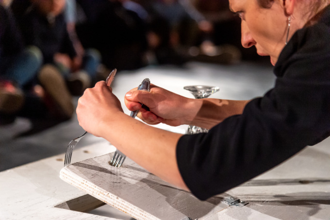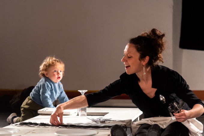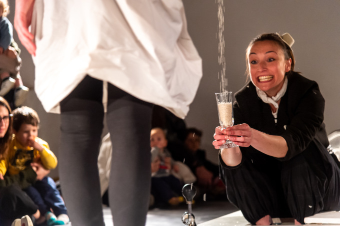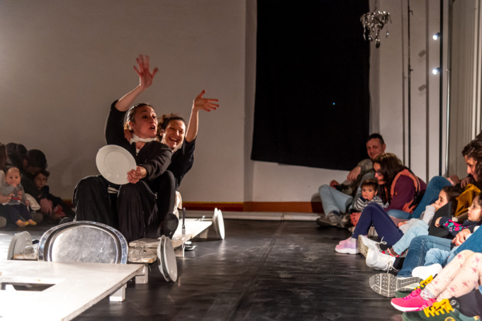 Uno spettacolo che coinvolge i piccolissimi (da 0 a 5 anni) in una scoperta multi sensoriale. L’osservazione iniziale porta l’attenzione sui suoni nel loro stato originario e coinvolge lo sguardo: lo spazio scenico è organizzato in modo da avere un rapporto quasi personale non solo tra attore e spettatore ma anche tra spettatore e spettatore, in un gioco di simmetria che coinvolge tutti i partecipanti seduti attorno al tavolo al centro della scena. Ed è attorno a quel tavolo che i bambini iniziano l’esplorazione di utensili, stoviglie; una ricerca che si trasforma anche in un evento comunitario grazie al continuo confronto tra io e l’altro. Accanto a me, di fronte a me.