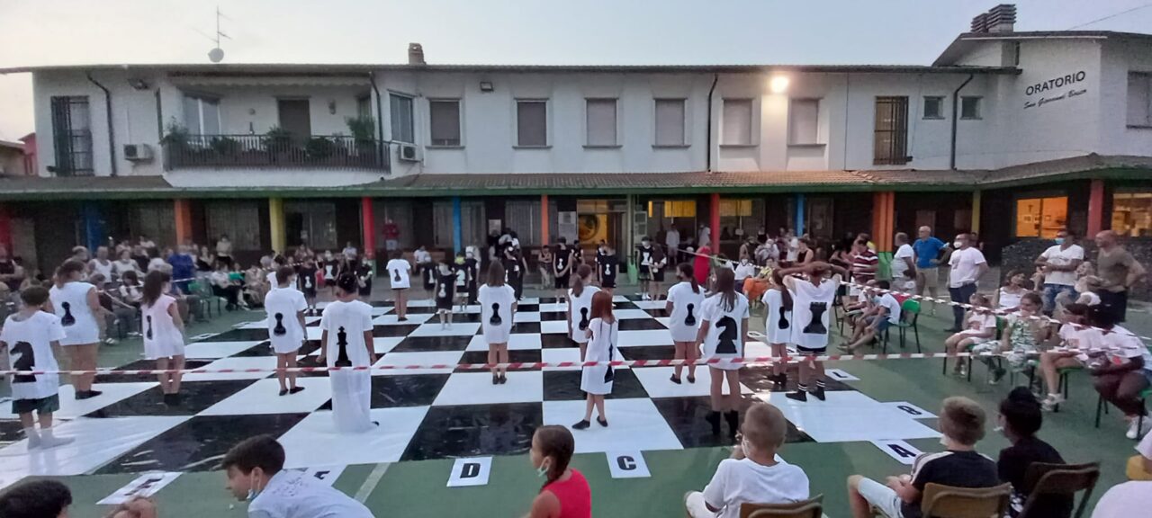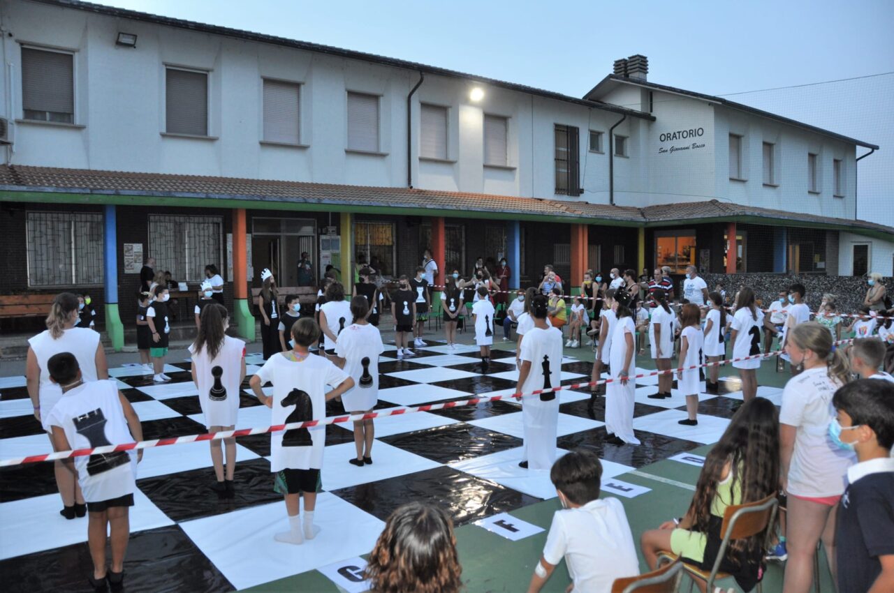 Una partita di scacchi viventi nella serata conclusiva dell’oratorio estivo. Si è tenuta venerdì 23 luglio, dalle ore 20,30, presso l’Oratorio San Giovanni Bosco a Chignolo d’Isola, la partita tra i ragazzi delle elementari.